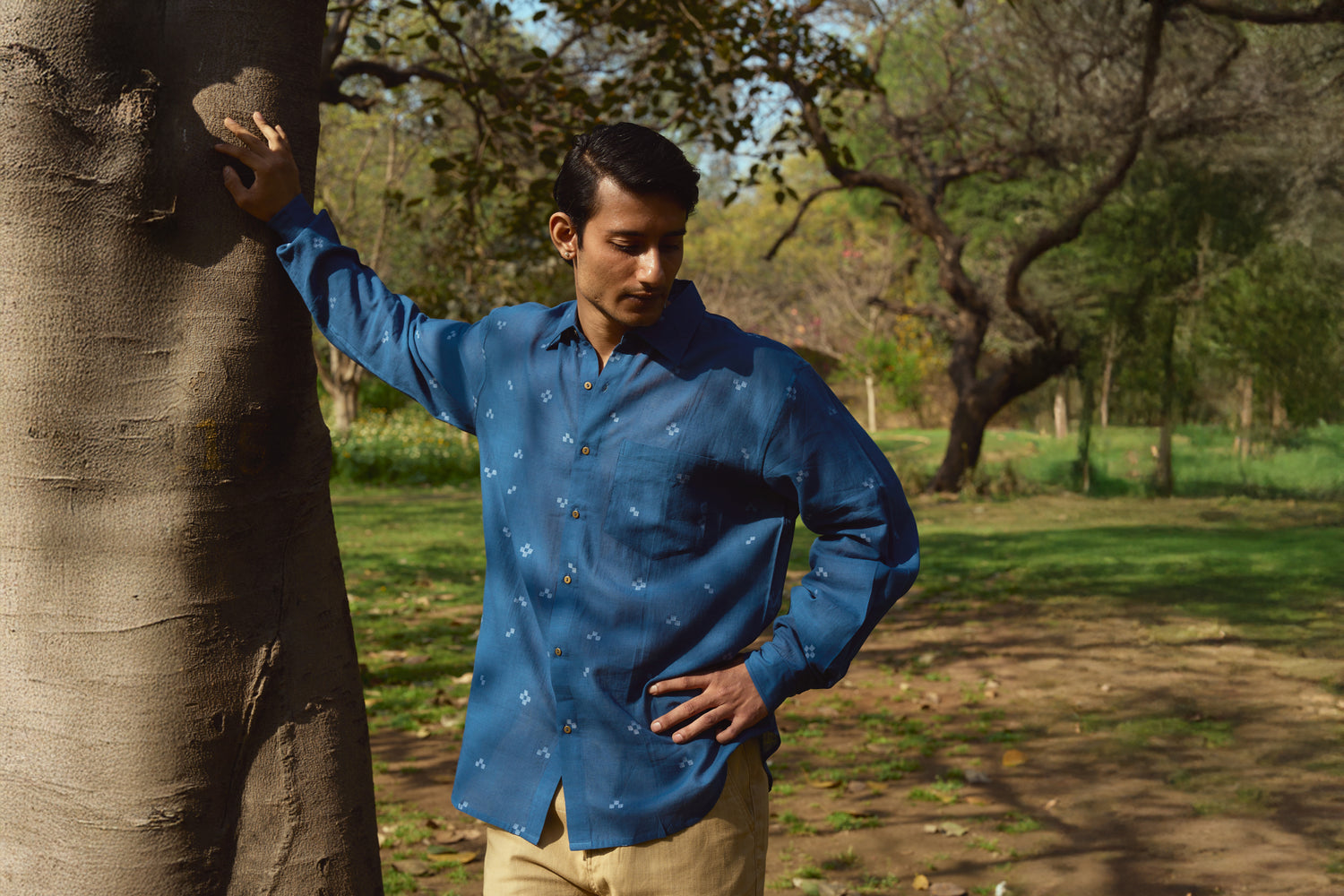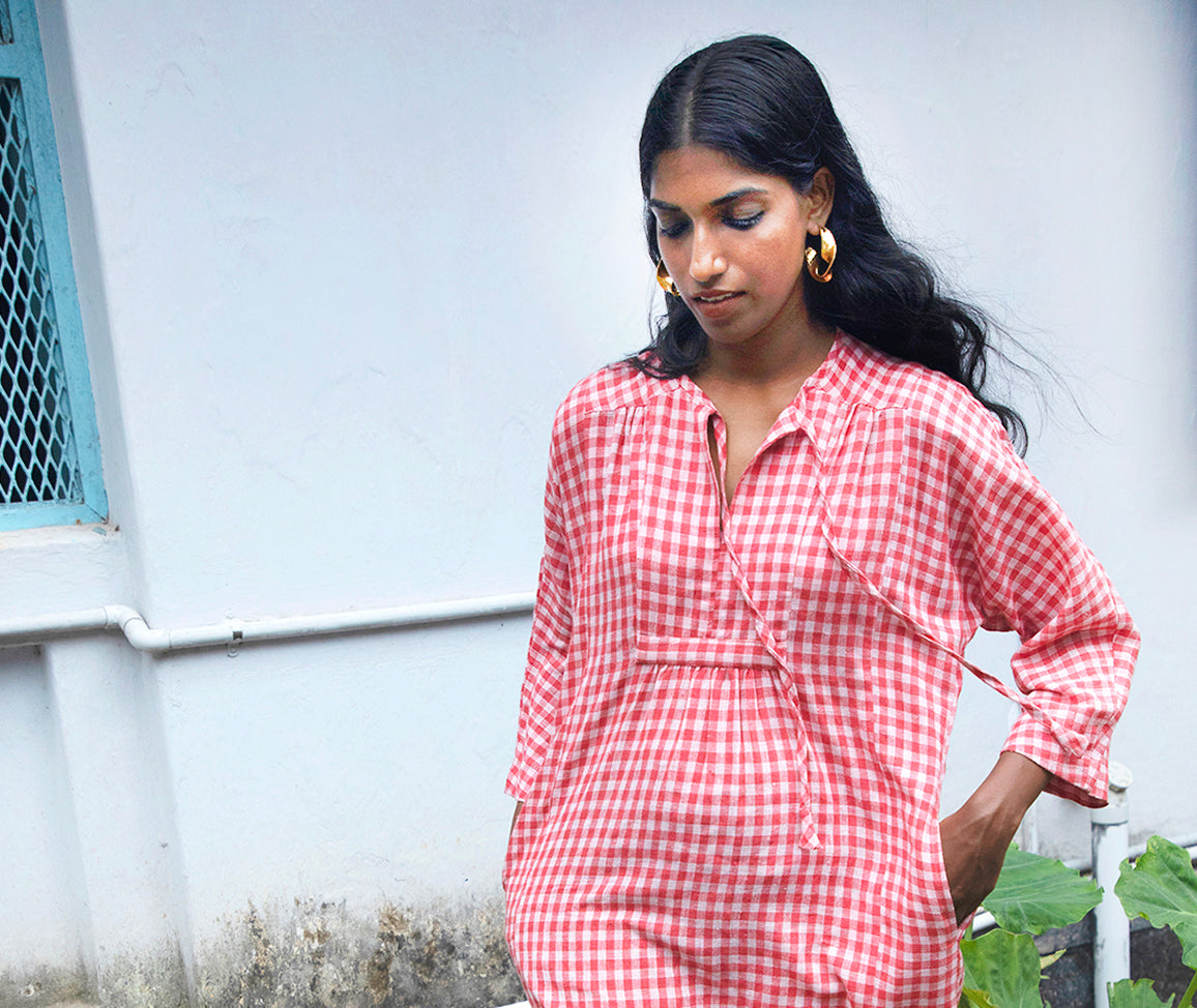 We are committed to using only natural fibers & materials and thus use handloomed kala cotton, khadi, organic cotton (GOTS certified) and silk with wood, hand-casted brass or shell buttons on our garments.