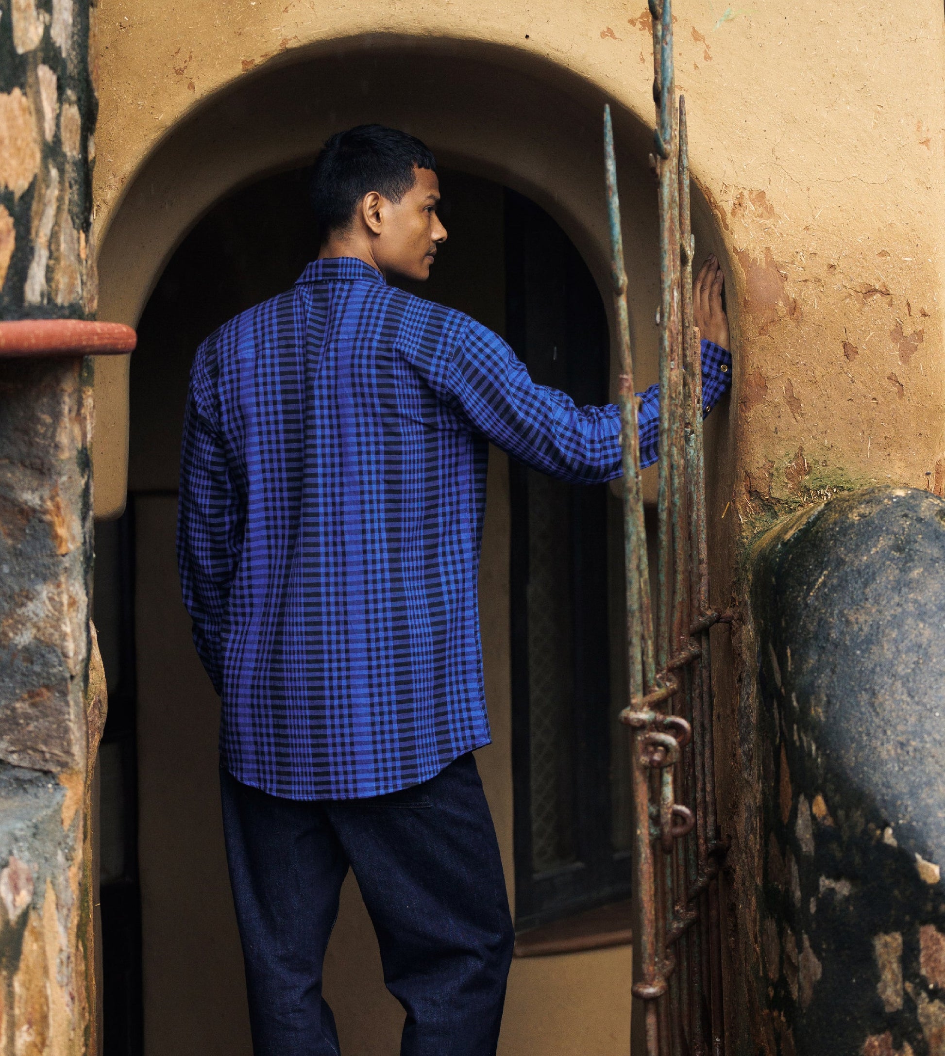 Men’s full sleeve shirt made from hand-woven Khadi cotton fabric and brass buttons. Wear it tucked or untucked, roll up your sleeves, and pair it with jeans or linen pants.